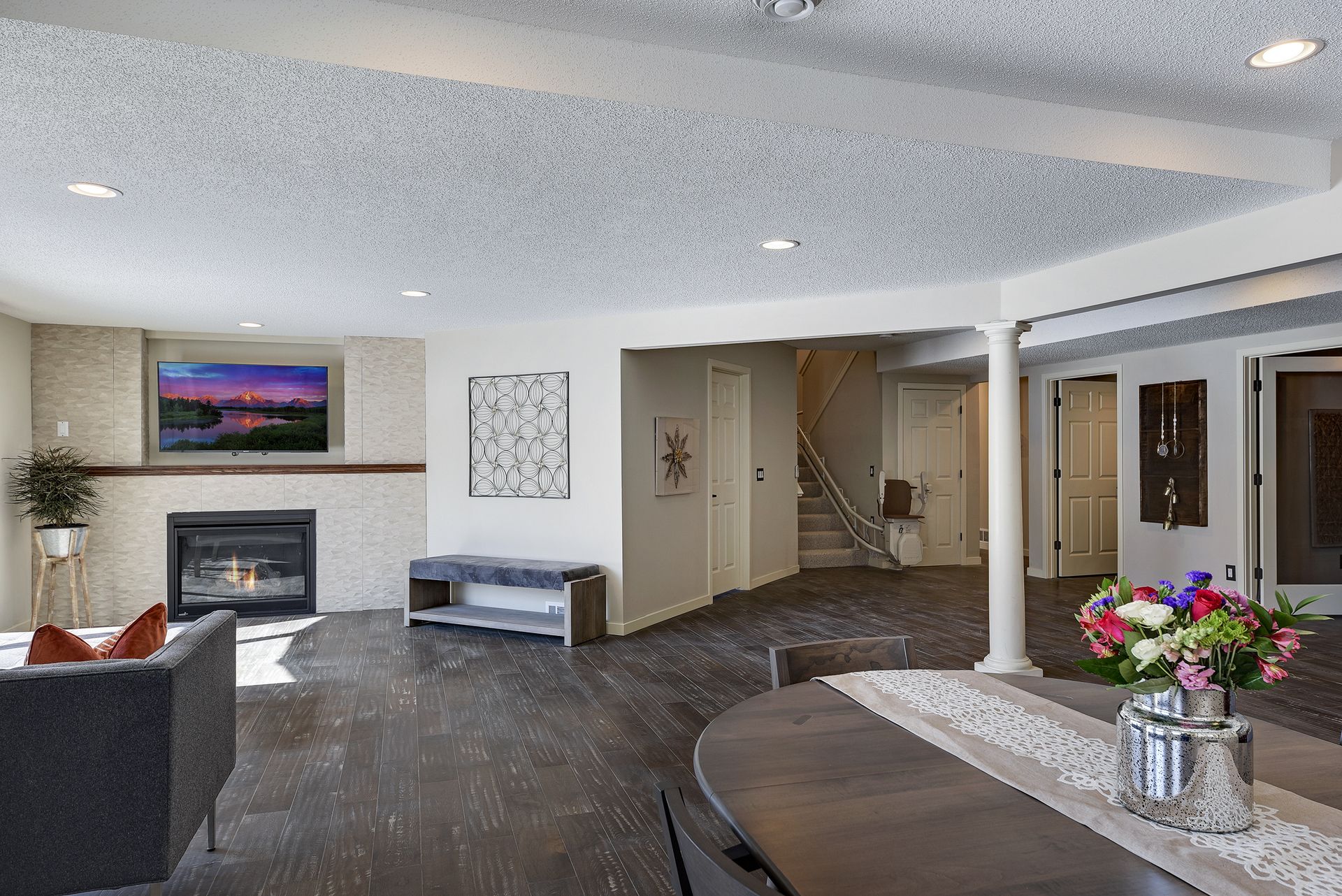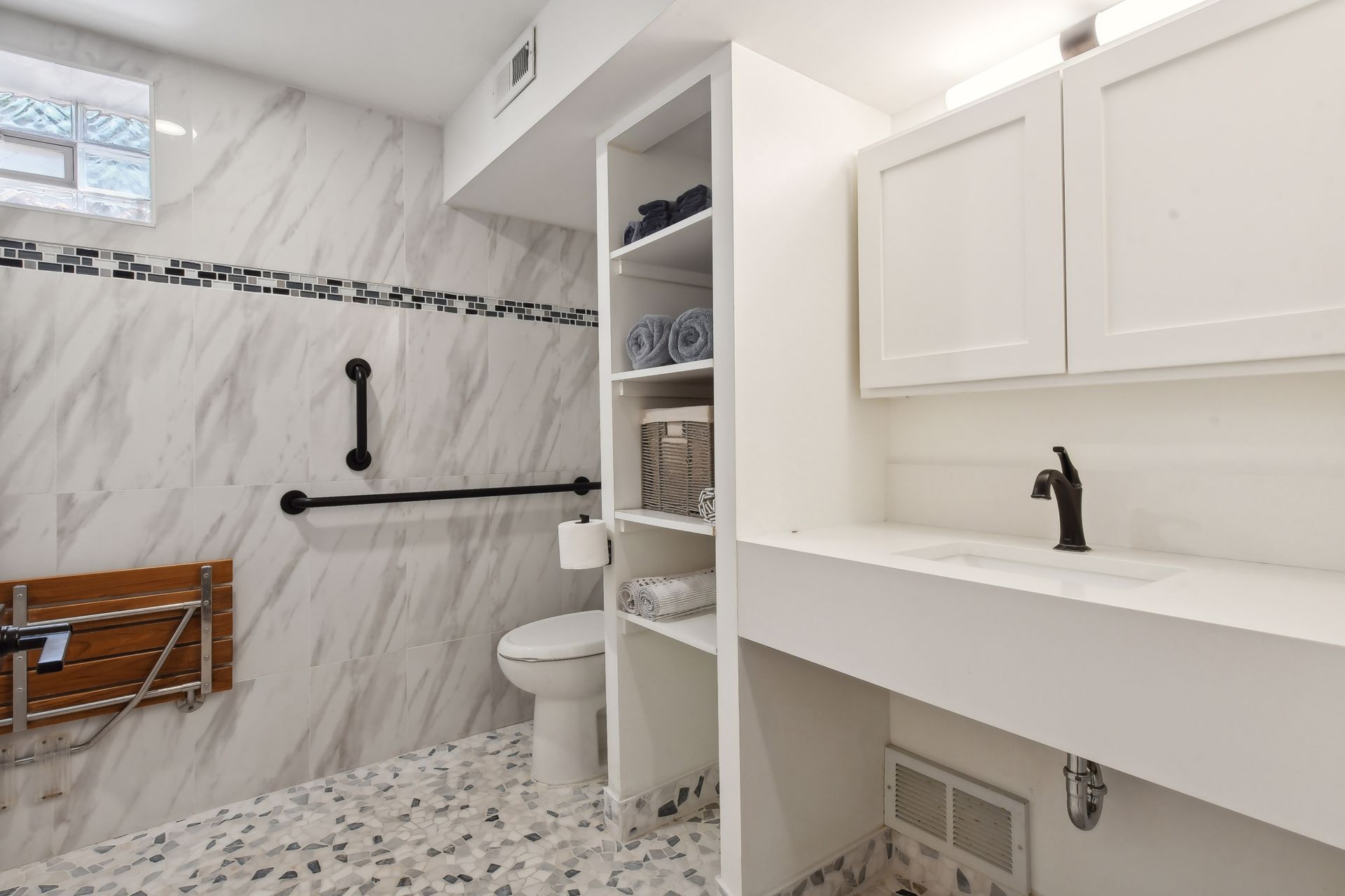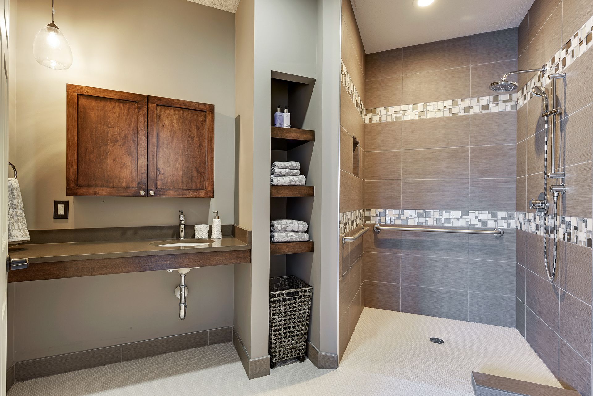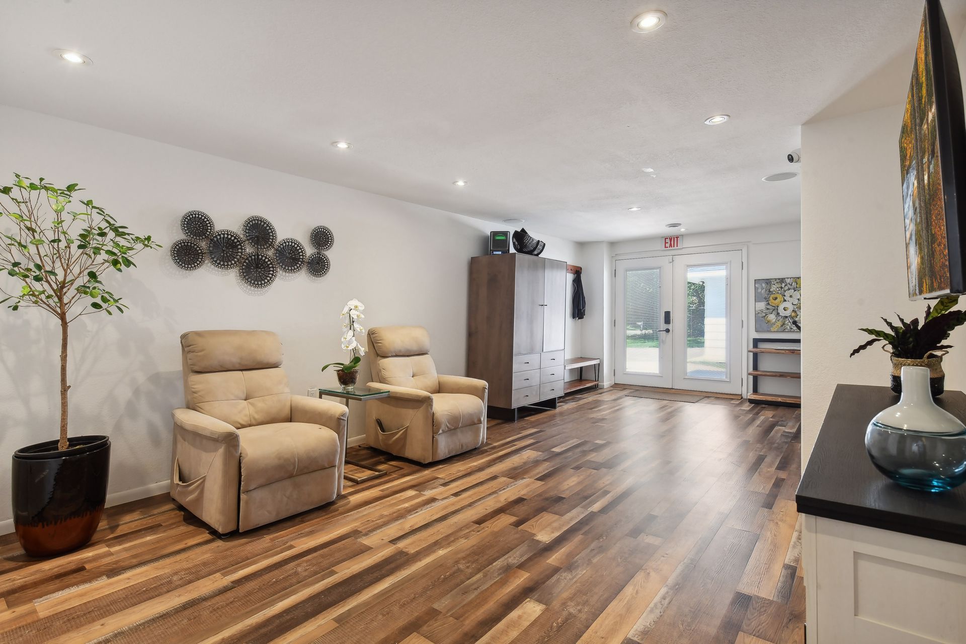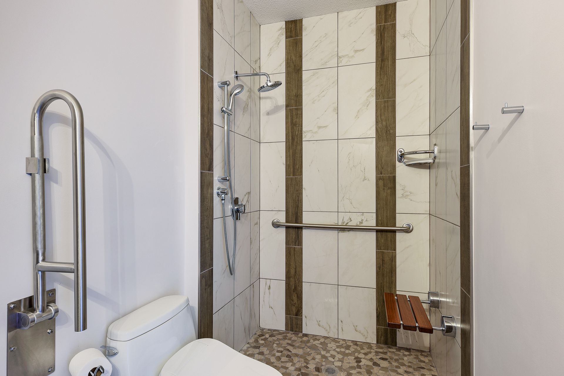 Syncare Grandview includes walk-in, fully tiled showers designed for safety and ease of use, along with an elevator that ensures seamless access across all three levels. The main living area features a warm, inviting fireplace, while the spacious lower level offers additional gathering and activity space highlighted by a second beautiful fireplace—ideal for relaxation, socialization, and therapeutic activities.