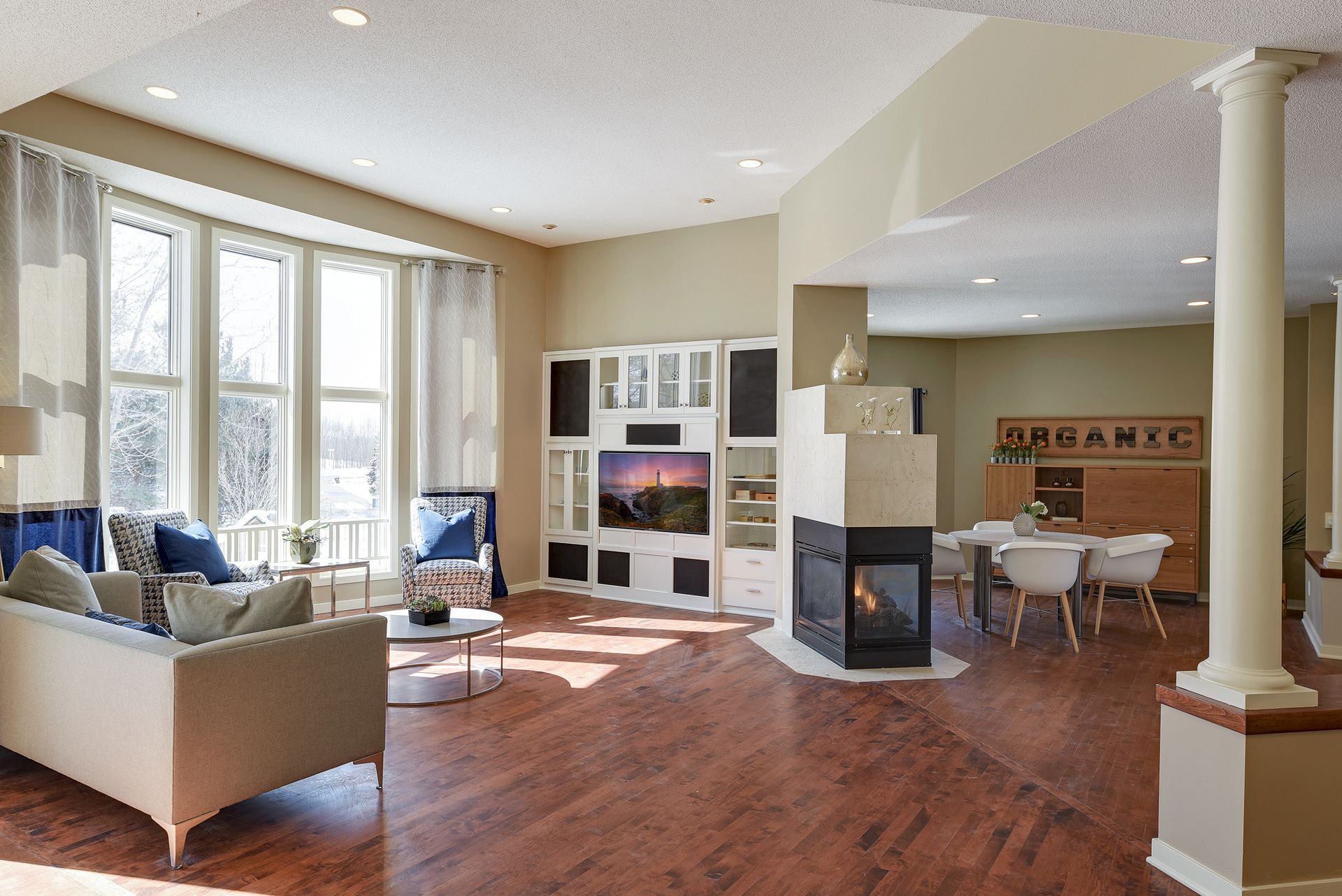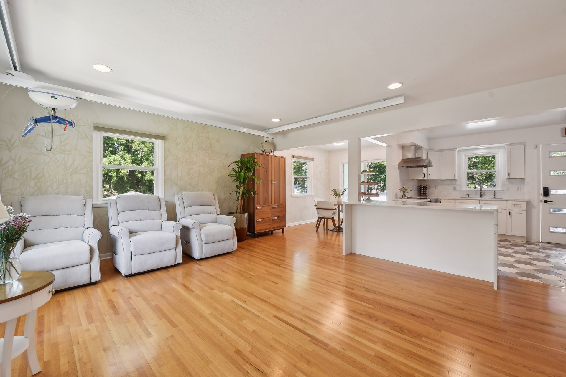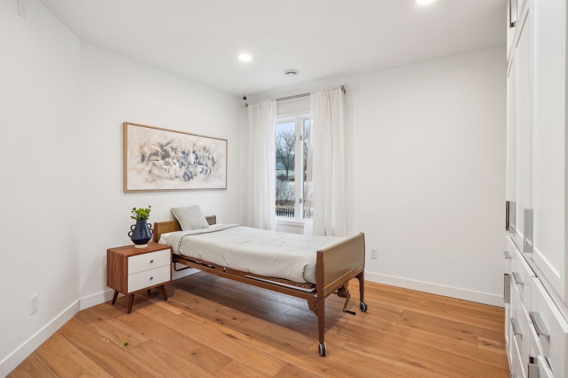 The home features hardwood flooring throughout and expansive open common areas that encourage movement, social interaction, and ease of navigation. Large windows provide abundant natural light and offer peaceful pond views, creating a calm and uplifting environment for residents.