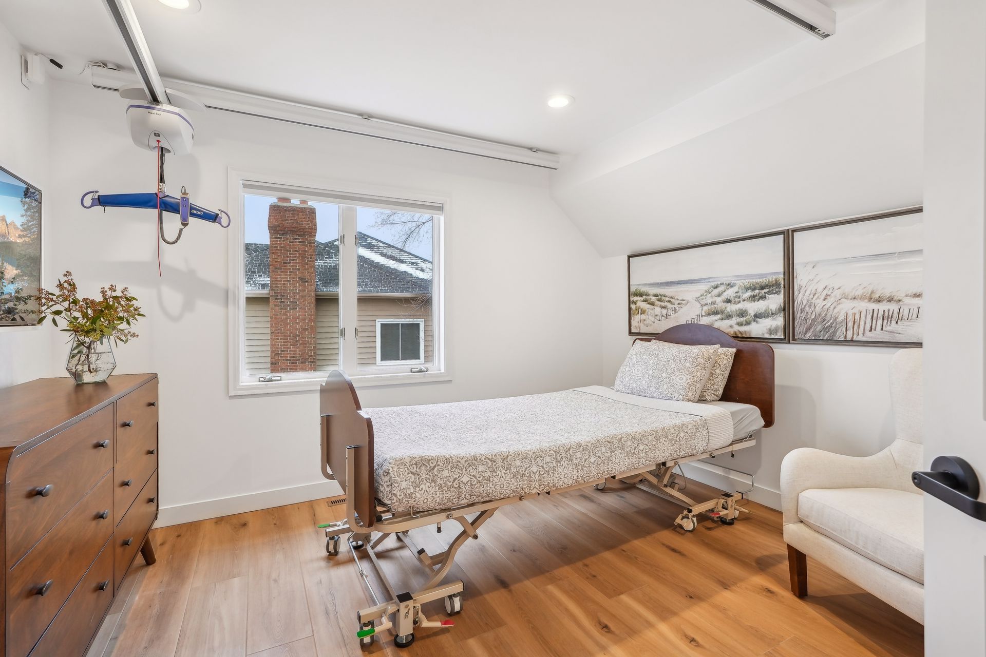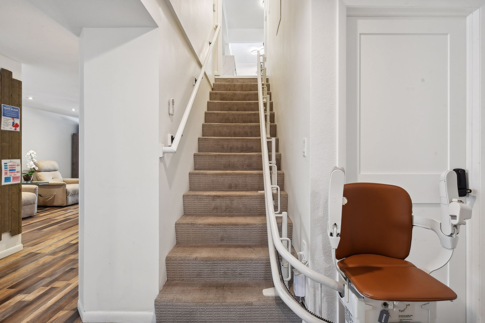 The layout offers open, light-filled living spaces that encourage movement, social interaction, and a sense of calm. To support residents across all levels of mobility, Syncare Grande is equipped with ceiling lifts and a stair lift, ensuring safe transfers and access between floors in this two-story home.